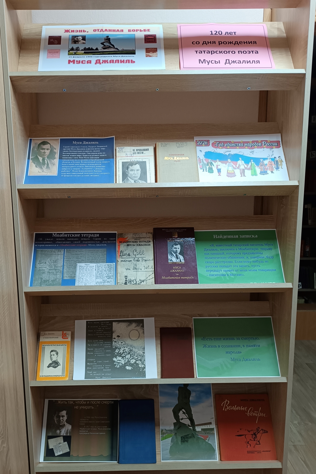Муса Джалиль – выдающийся татарский писатель, тонкий лирик и мужественный поэт-трибун. За свою бесстрашную антифашистскую борьбу поэт был посмертно удостоен звания Героя Советского Союза. Написанные им в гитлеровской тюрьме, незадолго перед казнью, пламенные стихи, составившие знаменитую «Моабитскую тетрадь» стали не только вершиной его поэтического таланта, но и историческим документом, обличающим ужасы войны и воспевающим силу человеческого духа. Центральная районная библиотека оформила выставку рассказ «Жизнь, отданная борьбе», к120-летию со дня рождения татарского поэта. На выставке представлены книги, рассказывающие о жизни и творчестве автора, сборники стихов, поэмы, баллады, письма Мусы Джалиля друзьям и близким людям. Выдающийся татарский поэт оставил неизгладимый след в истории литературы и в сердцах людей. Желаем нашим читателям заново переосмыслить творчество Музы Джалиля.