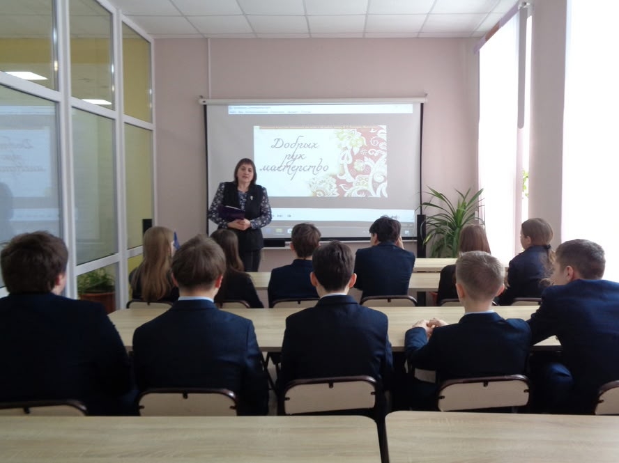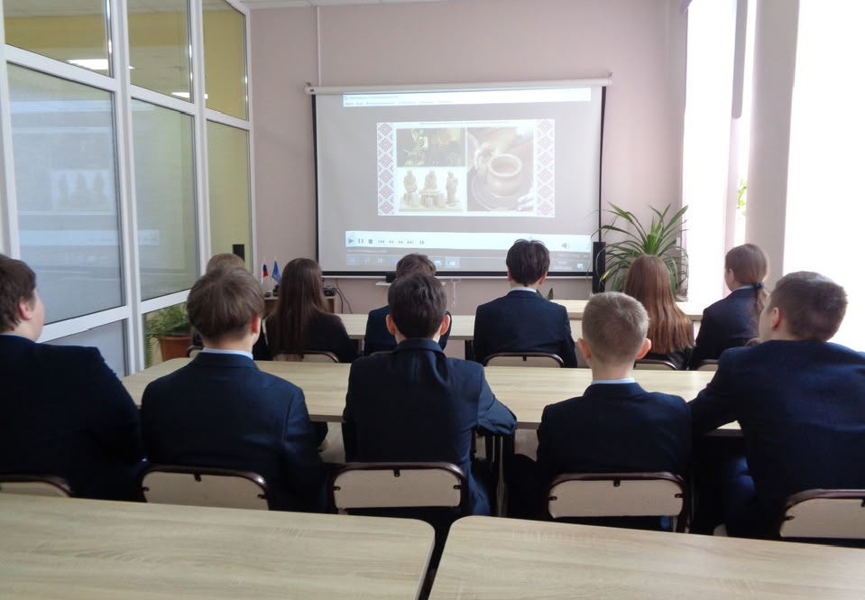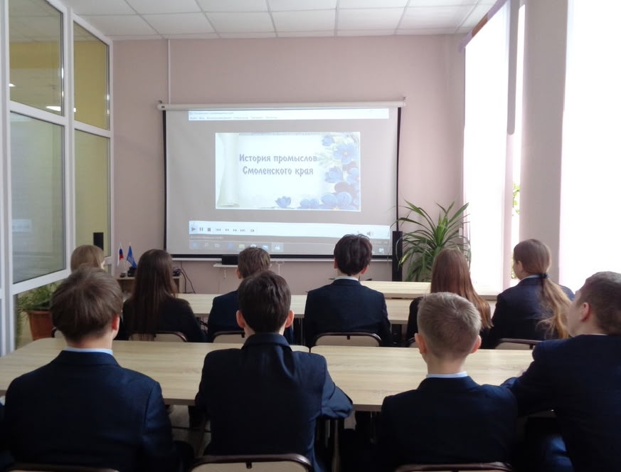 Ребята совершили путешествие в далёкое прошлое нашего края, познакомились с  традициями народных умельцев, с народными промыслами и ремёслами, развитыми на Смоленщине и сохранившимися по сей день. Библиотекарь познакомила школьников с промыслами смоленского края: с гончарным делом, с резьбой по дереву, с кузнечным ремеслом, ювелирным, стекольным, ткацким и другими промыслами.  Более подробно восьмиклассникам рассказали об истории возникновения «Смоленских украс», одного из основных видов прикладного искусства – вышивки, дети узнали о символах и образах смоленских узоров, а также о принадлежности определённых символов для разных уездов Смоленской губернии. Мероприятие  сопровождалось видеопрезентацией «История промыслов Смоленского края».