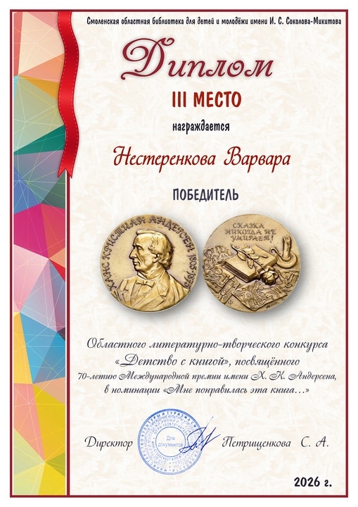 В библиотеке для детей и молодёжи имени И. С. Соколова-Микитова состоялось подведение итогов Областного литературно-творческого конкурса «Детство с книгой», посвящённого 70-летию Международной премии имени Ханса Кристиана Андерсена. Более 120 детей и подростков из 16 муниципальных округов региона и города Смоленска представили в библиотеку свои работы в 3 номинациях: оригинальные поделки и красочные рисунки по мотивам сказок Андерсена, разнообразные по содержанию и исполнению лэпбуки, краткие рассказы-эссе о любимых книгах.
